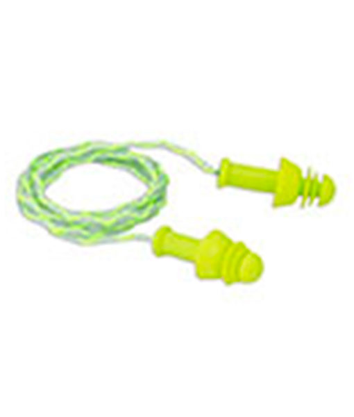 Tapones auditivos reutilizables con cordón «COMFORT-FIT» con bridas múltiples – Color verde lima – NRR 25 dB – 1 par por caja pequeña reutilizable, 100 pares por caja dispensadora – 10 cajas dispensadoras por caja